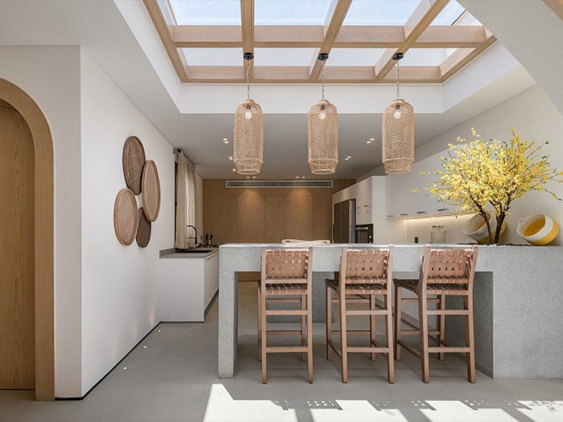 - Liên kết không gian phòng bếp và phòng khách sẽ tối ưu phần lớn không gian vì không có tường chắn.